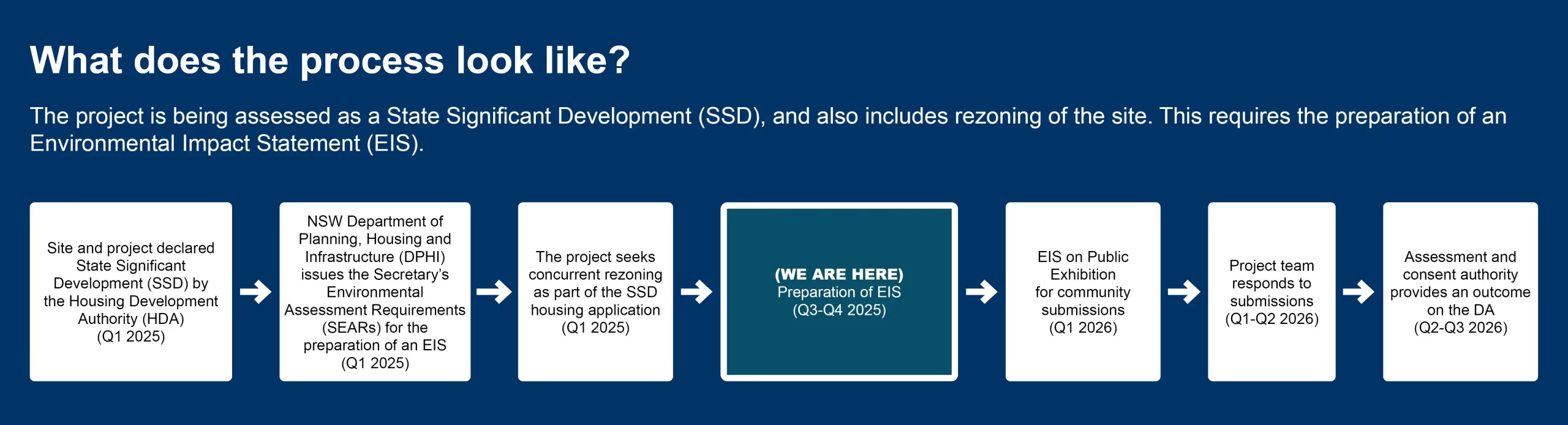 The proposal is currently in the Environmental Impact Statement (EIS) preparation phase (Q3–Q4 2025). Subject to the Department of Planning, Housing and Infrastructure (DPHI)’s assessment as the consent authority, the EIS will be placed on public exhibition in Q1 2026, and the community will be able to make submissions. Following this, the project team will respond to submissions (Q1–Q2 2026), and the consent authority will assess the application and provide a determination in Q2–Q3 2026. Note: these timeframes are subject to DPHI’s review and assessment